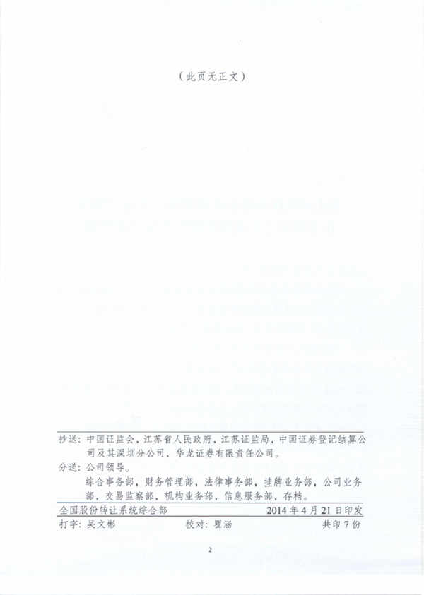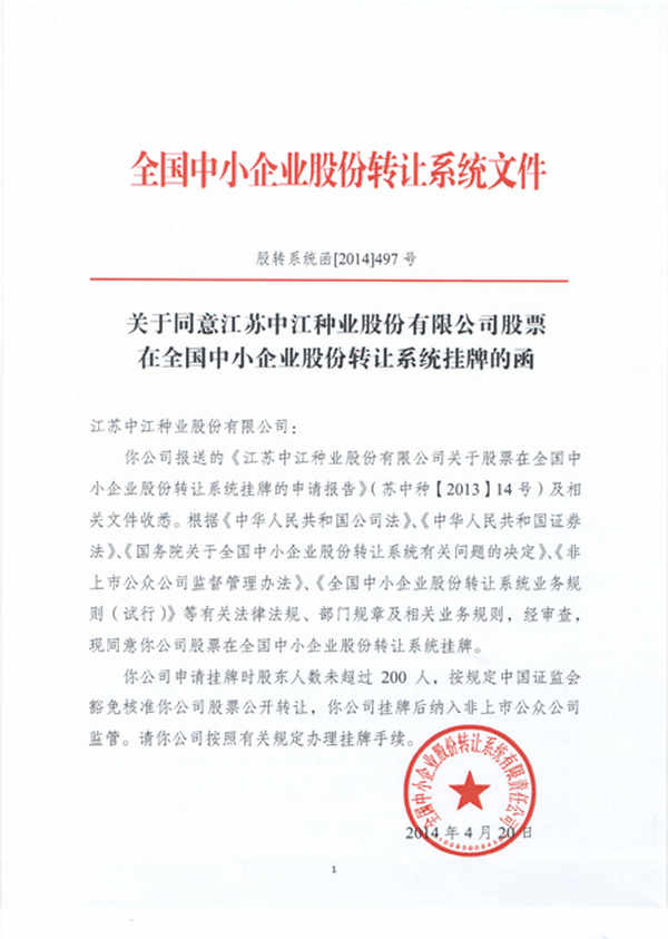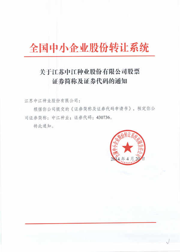 在三大中介的指導下,公司歷時9個月的不懈努力,經(jīng)全國中小企業(yè)股份轉(zhuǎn)讓系統(tǒng)有限責任公司同意,江蘇中江種業(yè)股份有限公司股票在全國中小企業(yè)股份轉(zhuǎn)讓系統(tǒng)掛牌,成為江蘇首家在新三板獲準掛牌的種業(yè)企業(yè)。證券簡稱:中江種業(yè);證券代碼:430736。