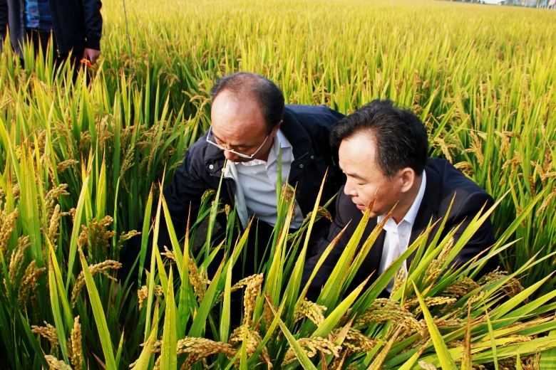 蔣總與南京農(nóng)業(yè)大學(xué)副校長(zhǎng)丁艷峰觀察“寧粳8號(hào)”的后期生長(zhǎng)情況
