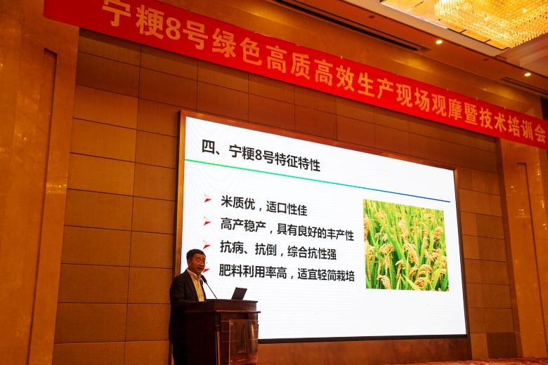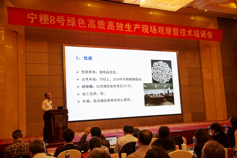 萬建民院士作了《“寧粳8號”的選育及特征特性介紹》報告;南京農(nóng)業(yè)大學丁艷鋒副校長為大會作了《“寧粳8號”優(yōu)質(zhì)高效栽培技術》專題培訓。省農(nóng)技推廣總站管永祥站長作了《全力推進稻米產(chǎn)業(yè)高質(zhì)量發(fā)展,努力打造新時代江蘇魚米之鄉(xiāng)》報告。