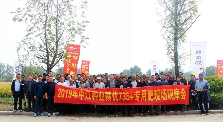 金秋十月,祖國華誕,崢嶸70載,與國同夢。2019年10月13日,來自江蘇,安徽區(qū)域的縣、鄉(xiāng)鎮(zhèn)經(jīng)銷商及種植大戶150余人,來到沭陽縣錢集鎮(zhèn)觀摩“贛優(yōu)735+專用肥”示范田。一下大巴車,映入眼簾的是80余畝“贛優(yōu)735+專用肥”示范田,一片黃燦燦的喜人景色。走到田間,大家紛紛夸獎品種表現(xiàn)不錯,個子矮,穗子大,粒子多,結(jié)實率高。大家對“贛優(yōu)735+專用肥”種植的田間表現(xiàn)非常滿意,良種良法,科學(xué)管理,紛紛表示明年一定要推廣。“災(zāi)年不減產(chǎn),豐年更高產(chǎn)”,這是已推廣該品種的經(jīng)銷商們最好的評價。