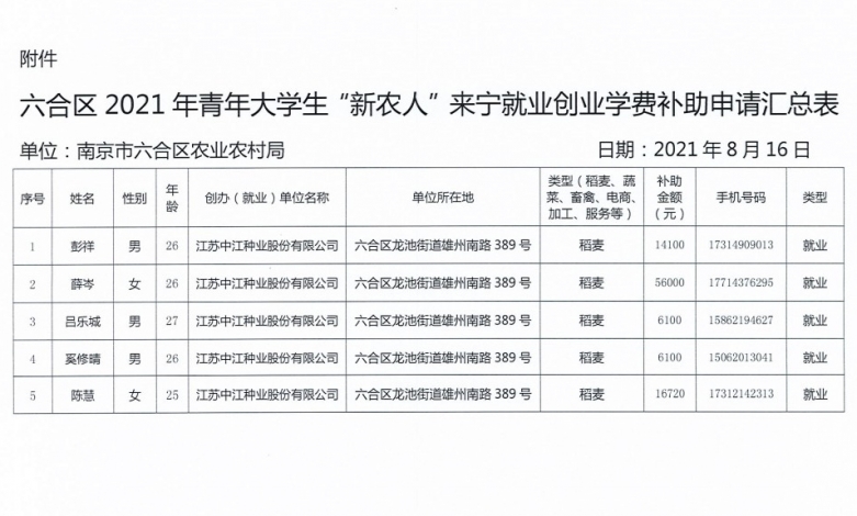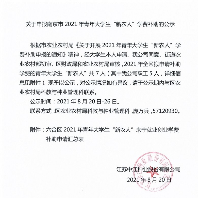 關(guān)于申報(bào)南京市2021年青年大學(xué)生“新農(nóng)人”學(xué)費(fèi)補(bǔ)貼的公示