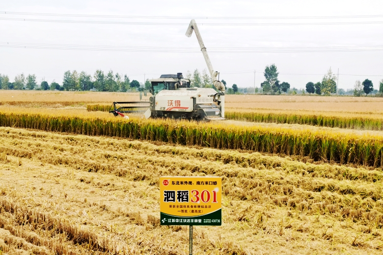 10月30日,由農(nóng)業(yè)農(nóng)村部全國農(nóng)技推廣服務(wù)中心組織專家組,赴宿遷市泗洪縣石集鄉(xiāng)毛山村,對江蘇省農(nóng)業(yè)科學(xué)院宿遷農(nóng)科所和江蘇中江沃達(dá)豐種業(yè)科技有限公司申報(bào)超級稻認(rèn)定的泗稻301百畝高產(chǎn)示范方進(jìn)行現(xiàn)場實(shí)收測產(chǎn)。測產(chǎn)專家組在對示范方進(jìn)行整體考察評估后,隨機(jī)抽取3處田塊,進(jìn)行現(xiàn)場機(jī)收測產(chǎn)。經(jīng)過丈量面積、清機(jī)后機(jī)收、水分測量、過磅稱重、水分折算等環(huán)節(jié),最終得出泗稻301實(shí)收畝產(chǎn)781.9公斤(水分按14.5%計(jì)算)。專家組一致認(rèn)為,今年7-8月份江蘇省水稻幼穗分化期及抽穗揚(yáng)花期遭遇有氣象記錄以來極端高溫干旱氣候,10月上中旬又連續(xù)兩次遭受低溫冷害影響等諸多不利氣候條件,泗稻301仍然實(shí)現(xiàn)了大面積增產(chǎn),實(shí)屬不易。