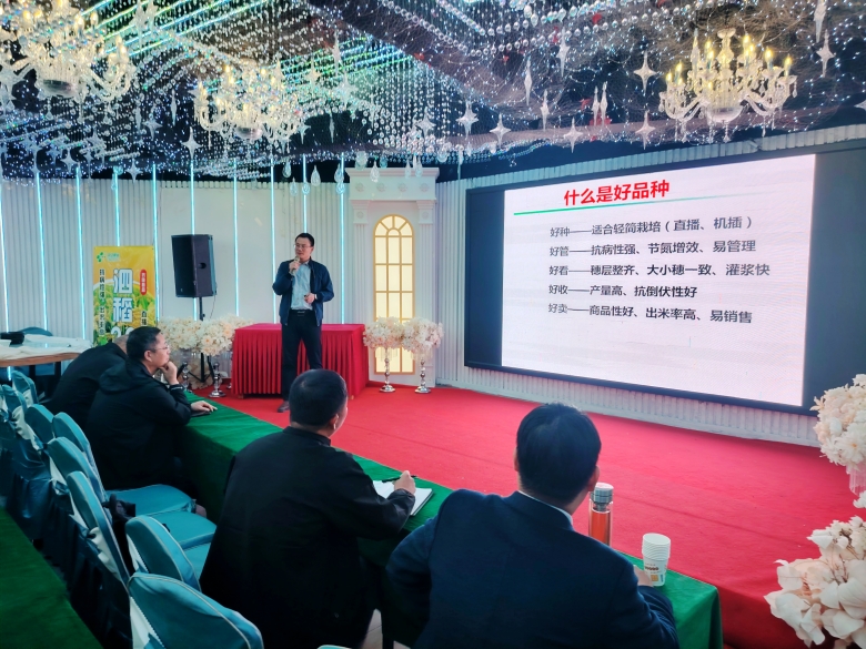 隨后的室內(nèi)會議由宿遷中江種業(yè)市場部經(jīng)理侍超主持。江蘇省農(nóng)業(yè)科學(xué)院宿遷農(nóng)科所水稻室主任陳春應(yīng)邀出席,系統(tǒng)介紹了“輕簡豐產(chǎn)型品種泗稻22號”與“優(yōu)質(zhì)食味型品種泗稻301”的選育背景及特征特性,參會經(jīng)銷商對兩個(gè)品種的核心優(yōu)勢有了更深入的理解。
