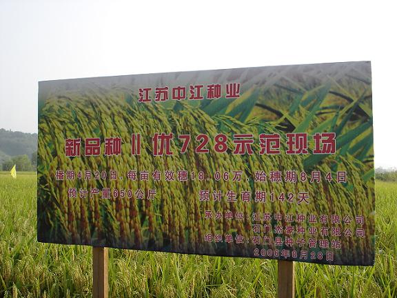 2006年8月28日上午,在湖南省常德市石門縣,我公司組織湖南省相關(guān)職能部門以及經(jīng)銷商參觀中江種業(yè)自育高產(chǎn)優(yōu)質(zhì)新品種II優(yōu)728的現(xiàn)場(chǎng),與會(huì)專家及各地代表都認(rèn)為:II優(yōu)728苗期長(zhǎng)勢(shì)旺,分蘗力強(qiáng)、抗倒抗病,結(jié)實(shí)率高,產(chǎn)量高,是一個(gè)適合當(dāng)?shù)胤N植的好品種。